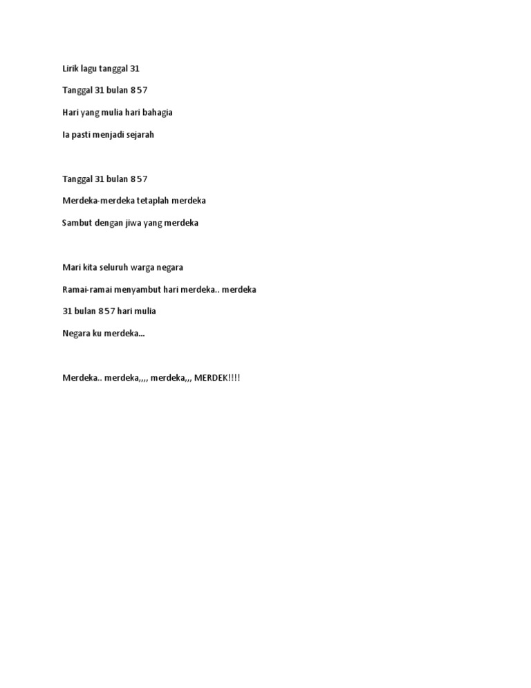 Lagu patriotik Other contents. Tetaplah merdeka Ia pasti menjadi sejarah Tanggal 31 Bulan lapan lima puluh tujuh Hari yang mulia Hari bahagia Sambut dengan jiwa yang merdeka. Menjelang ramadhan banyak umat islam yang mencari file pdf bacaan bilal sholat tarawih dan sholat witir.